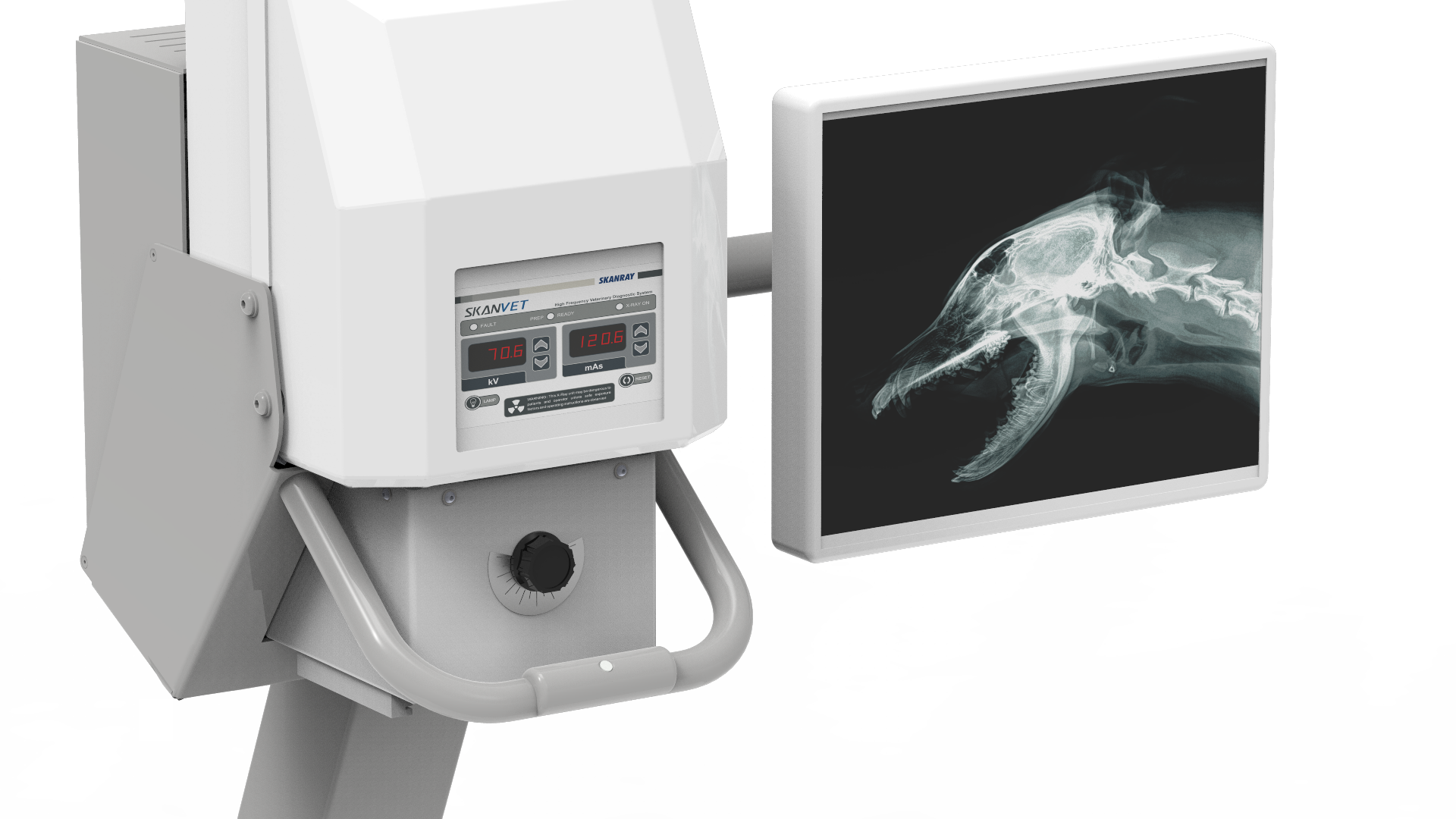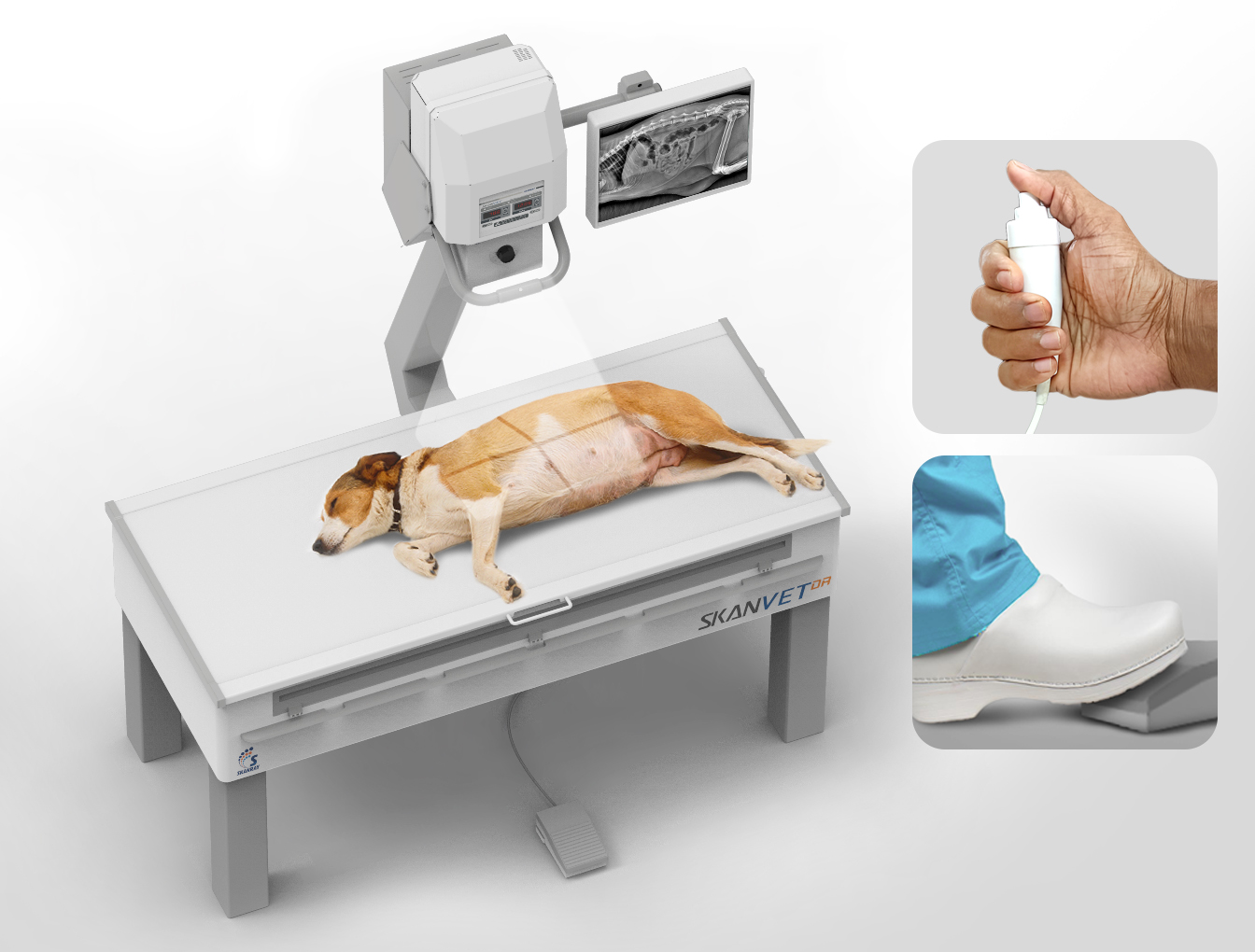 - Floor space requirement is as low as 5.3’ x 3.4’ enabling the smallest of the VET clinics to have a fully functional and features’ packed X-ray system